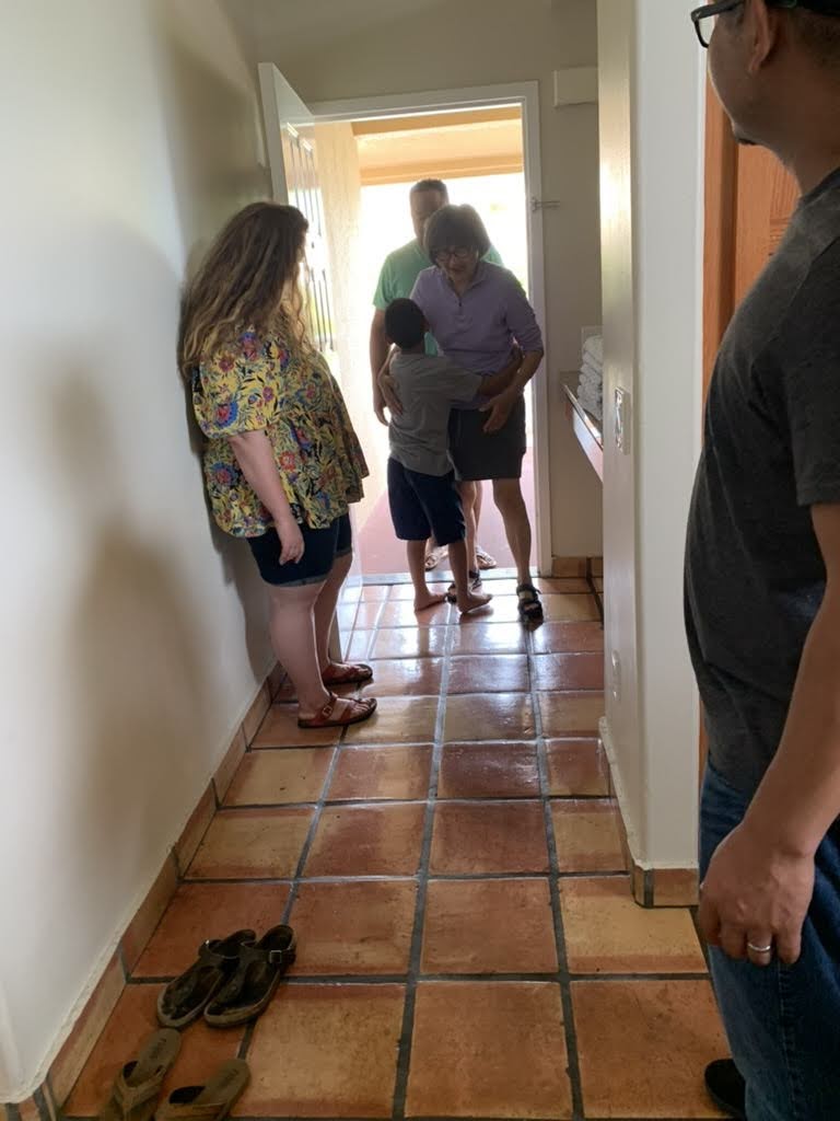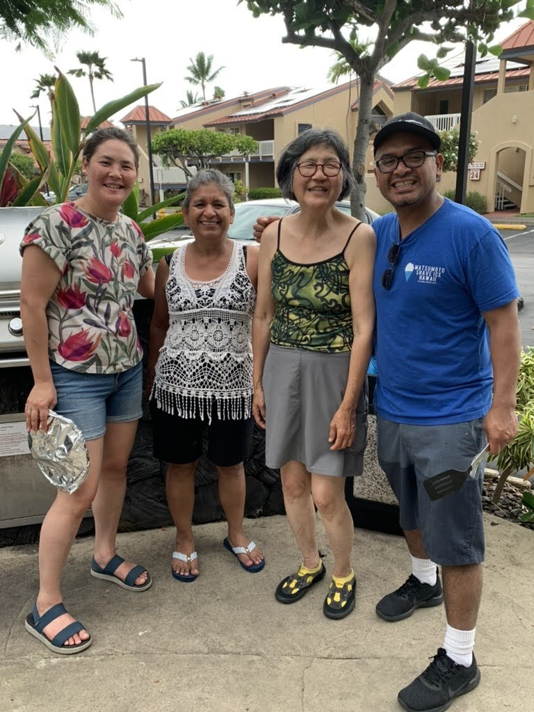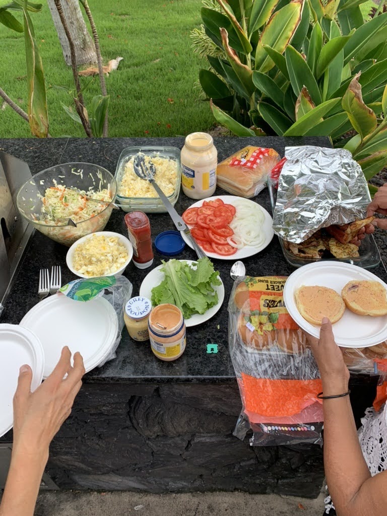 On Monday, we packed into the Forrest Ramirez car and drove down the road to Magic Sands Beach. Everyone got an adrenaline rush from the pummeling waves, whether or not they waded in. In fact, the girls stayed on the beach, and found out quickly why it’s called Magic Sands- when the tide is high, the sand is submerged so quickly, it disappears like magic. Daisuke, Jose, Manuel and Corey couldn’t get enough of the waves, even after losing glasses and one’s footing many times over! Auntie Jamie, Saya and I ate lunch from a local shack before heading back. Sachi and Bachan had already bonded over naps and were home an hour before. After hours at Magic Sands Beach, Daisuke returned to the resort ready to swim! He is a little fish! I opted for grocery shopping before dinner rather than swimming again. I was wiped! Jose, Miya and Christina hosted the first family meal of chicken, slaw and watermelon and it hit the spot! The barbecue grills stationed all over the resort were a perfect set up for our trip.