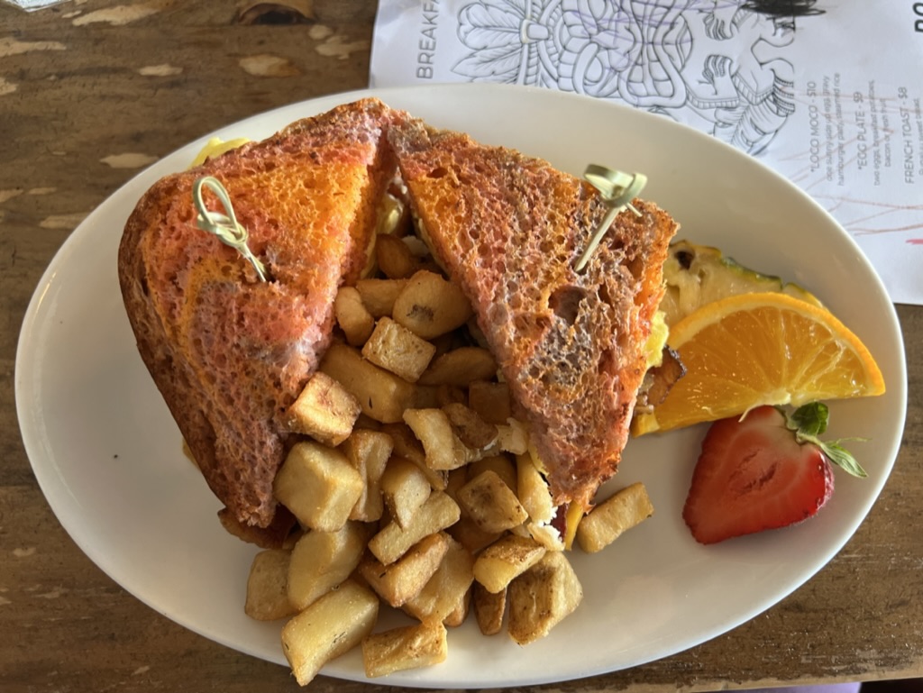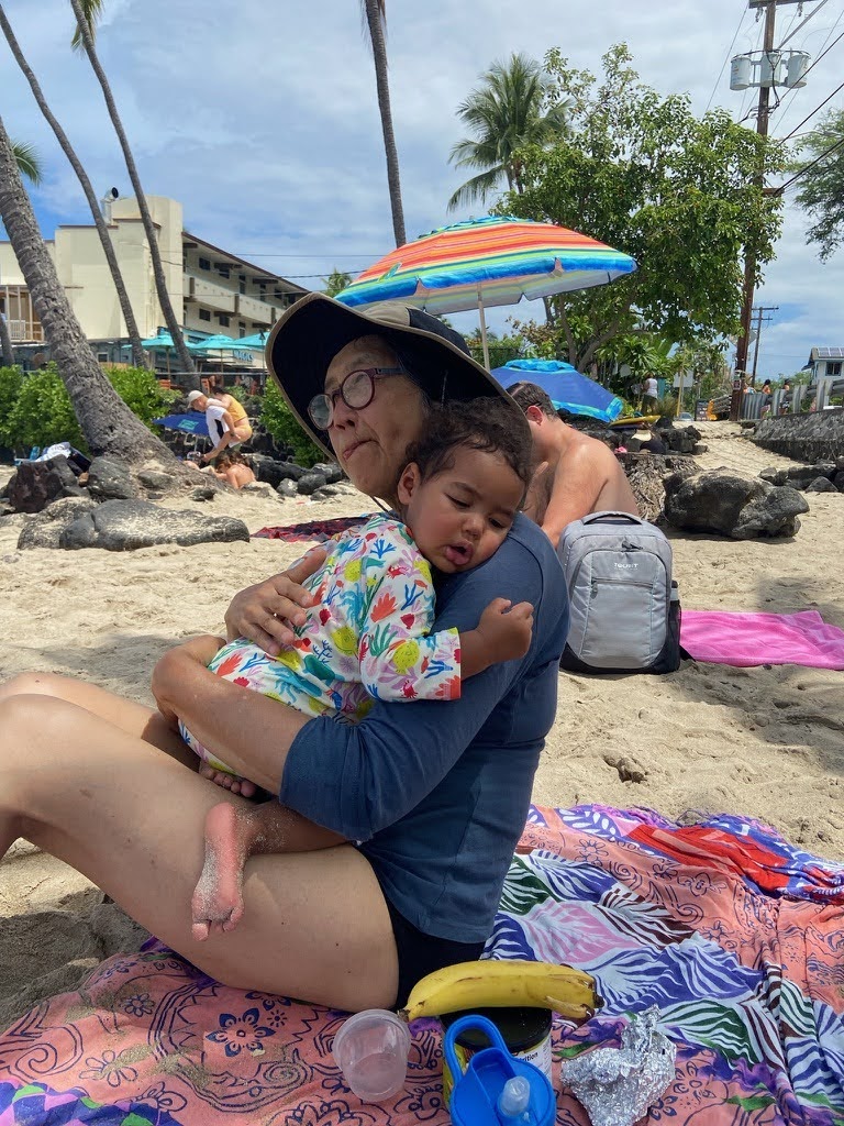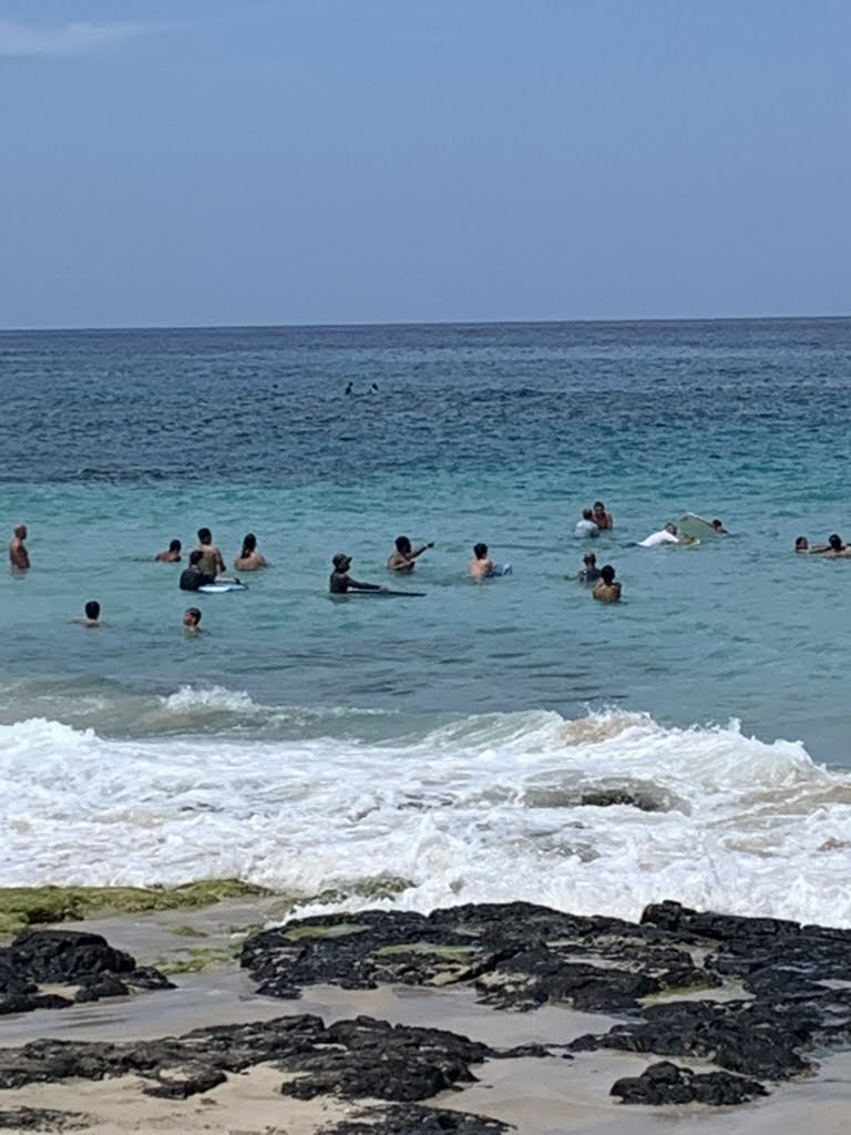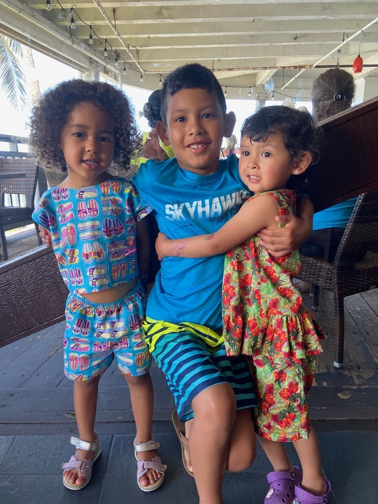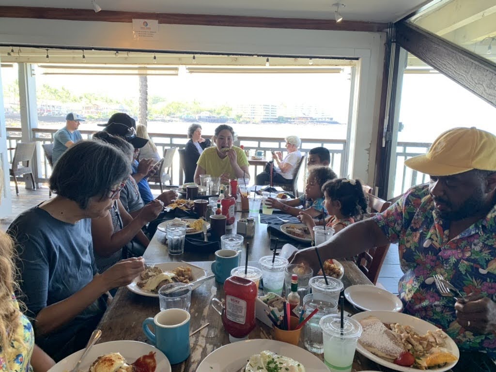 The Hele-on Trolly stop was an uphill hike into the shopping center that became a part of our daily routine. On Tuesday, we headed out in search of macadamia nut pancakes for Jose’s birthday breakfast, and found unicorn bread instead. We spent the day in Kailua -Kona, doing a bit of shopping before arriving at a very kid friendly beach at Kamakahonu Kailua Pier. The waves were calm enough for us to rent a stand-up paddle board, or SUP. The fun continued as we took turns scrambling on, falling off, and riding into busier waves outside of the protected cove. The only way to close out this afternoon was shave ice! That evening, Corey grilled beef and chicken to celebrate Corey D and May’s arrival to Kona! The first night of volleyball was epic as Jamie would say, and the kids played so wonderfully in the sand with Bachan heading up the baby sitting duties.