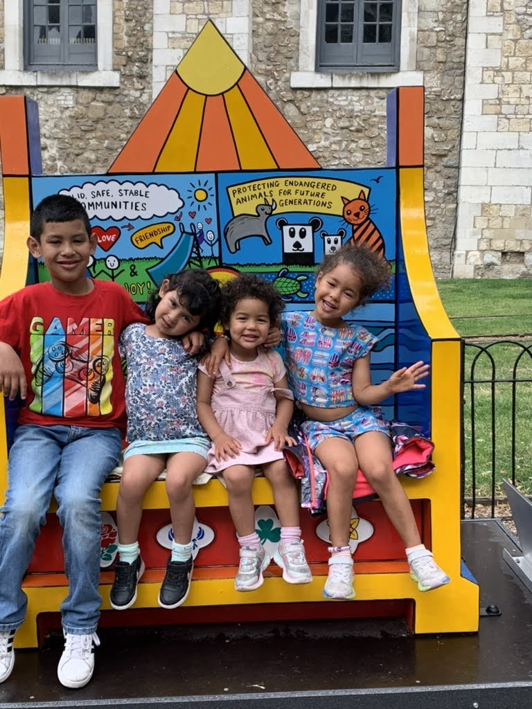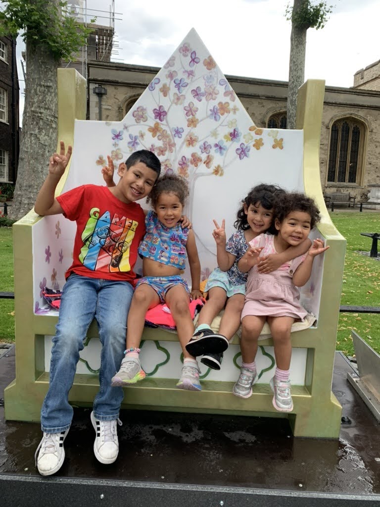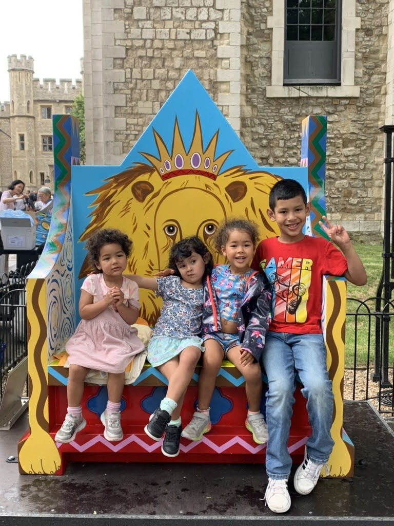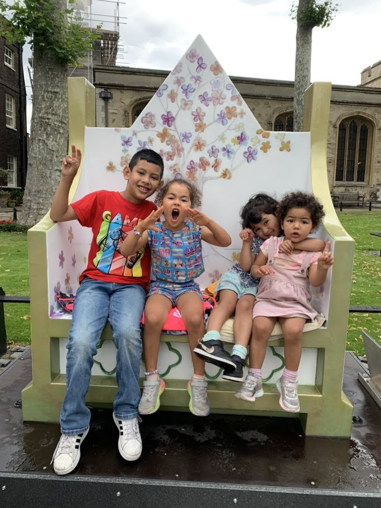 The Tower of London was another wet day, but cousins don’t mind that. We saw the crown jewels, climbed the White Tower, and ducked into a pub for an afternoon snack. The highlight on the grounds were the Coronation benches designed by school children in a national competition. We couldn’t get better pictures of the kids, and with twelve benches, this became an activity in itself… a scavenger hunt to nab seats where people were just getting up.