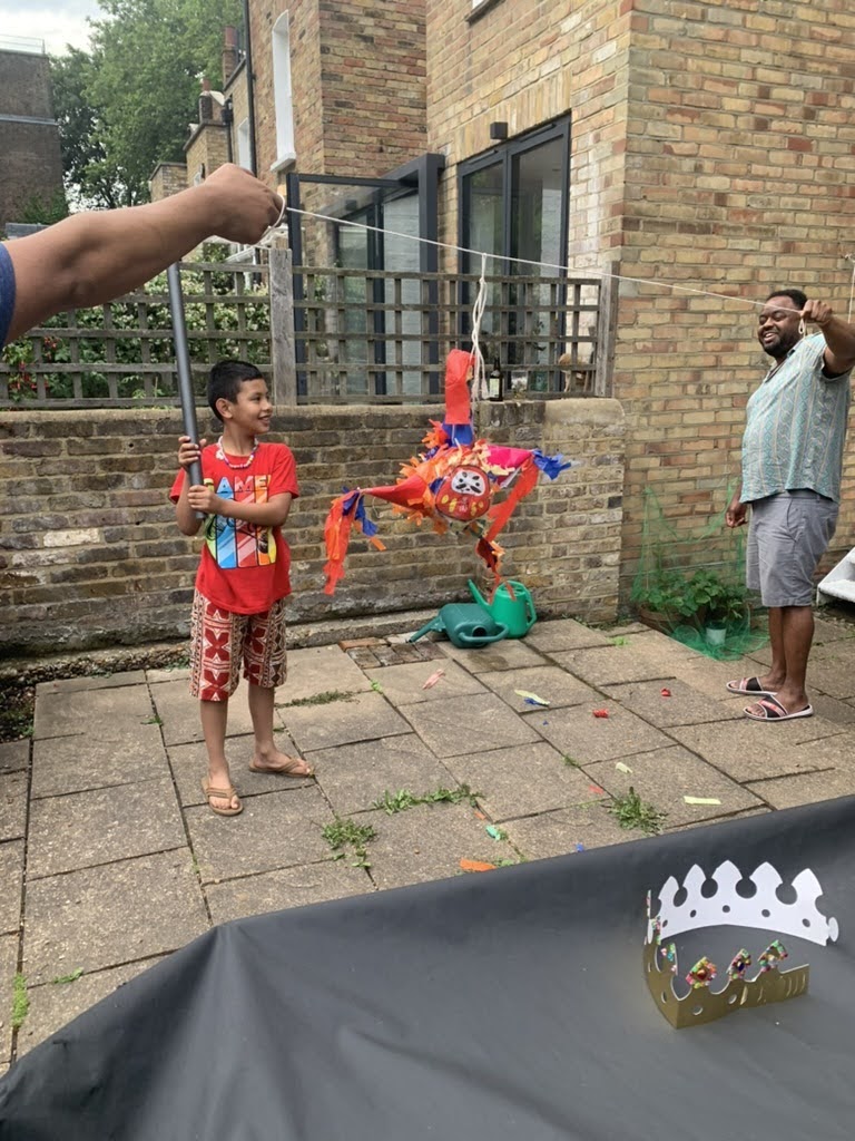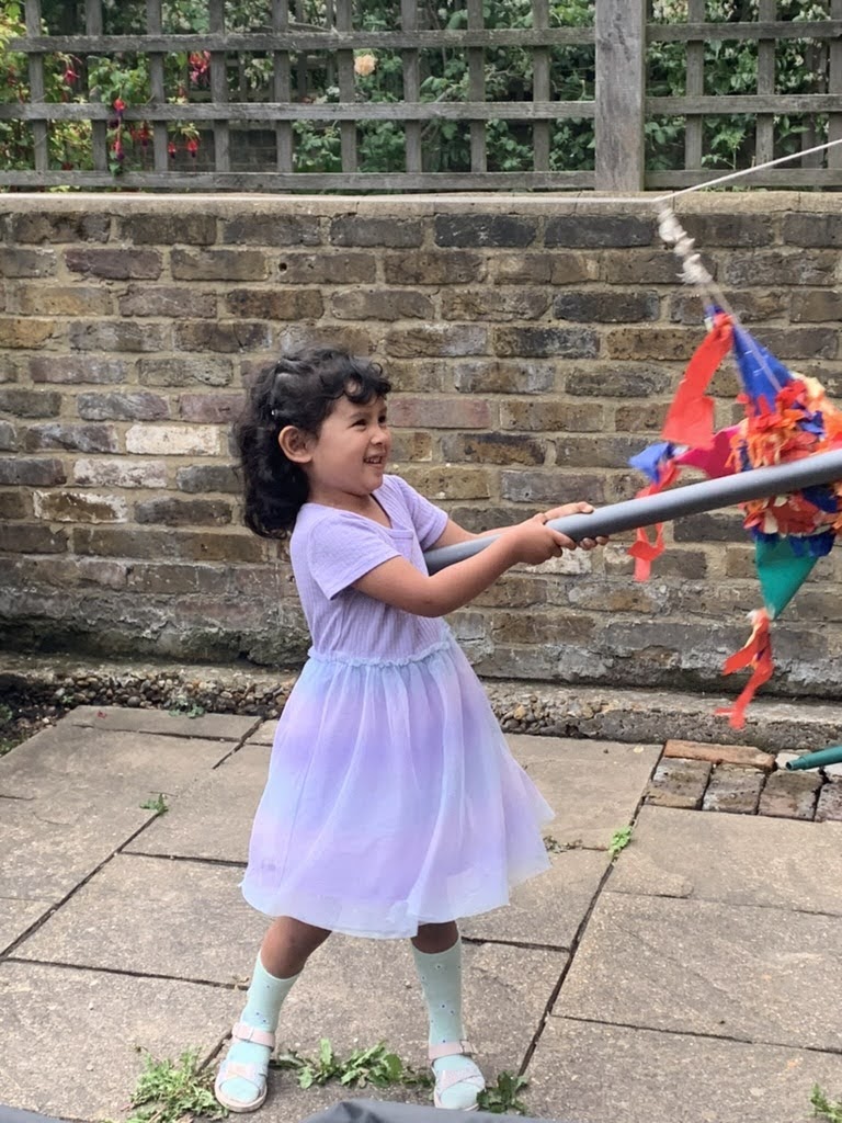 A couple months back, Saya and I built a model piñata as a template for what a larger one might look for her birthday next year, and Daisuke and Emiko’s visit was the perfect time to fill it and bust it open. Tio taught us a song to sing when each person is going to bat. We will definitely need to have a voice recording of that come May 2024. We were all thoroughly entertained with Corey and Jose holding the ropes!