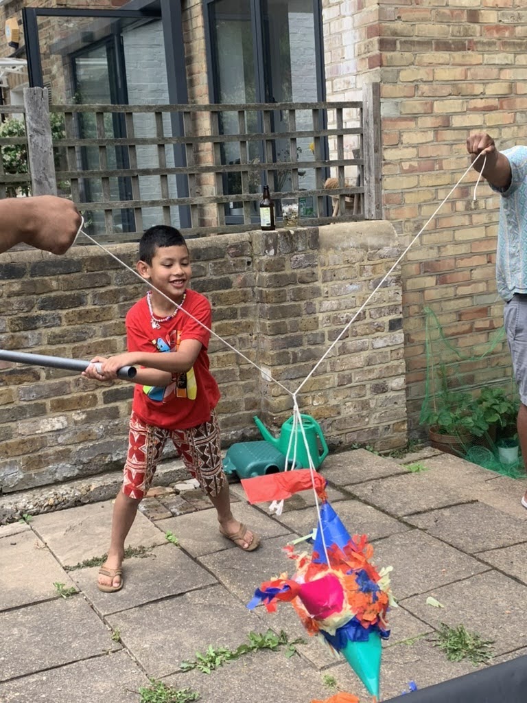 A couple months back, Saya and I built a model piñata as a template for what a larger one might look for her birthday next year, and Daisuke and Emiko’s visit was the perfect time to fill it and bust it open. Tio taught us a song to sing when each person is going to bat. We will definitely need to have a voice recording of that come May 2024. We were all thoroughly entertained with Corey and Jose holding the ropes!