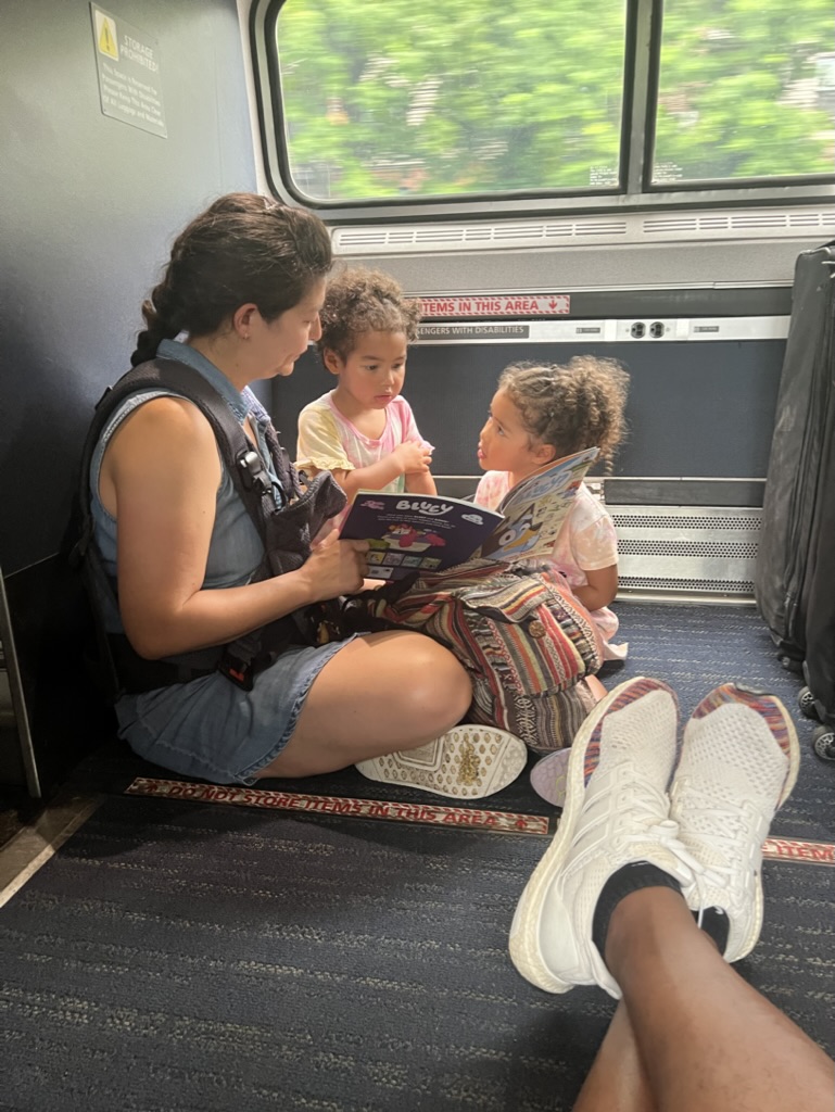 On the Sunday of the wedding, we didn’t need to catch our train until 1pm. Kyle recommended a great playground right on a lake for our morning jaunt. The climbing structures were sailor and aquatic themed. The light rain made meant we had the playground practically to ourselves, making it an even more magical space. The initial start of our Amtrak journey found us on the floor, with all seats taken. But a friendly conductor found us a table in the restaurant car, and we spent the rest of the journey chatting with the staff while the girls colored in their books.