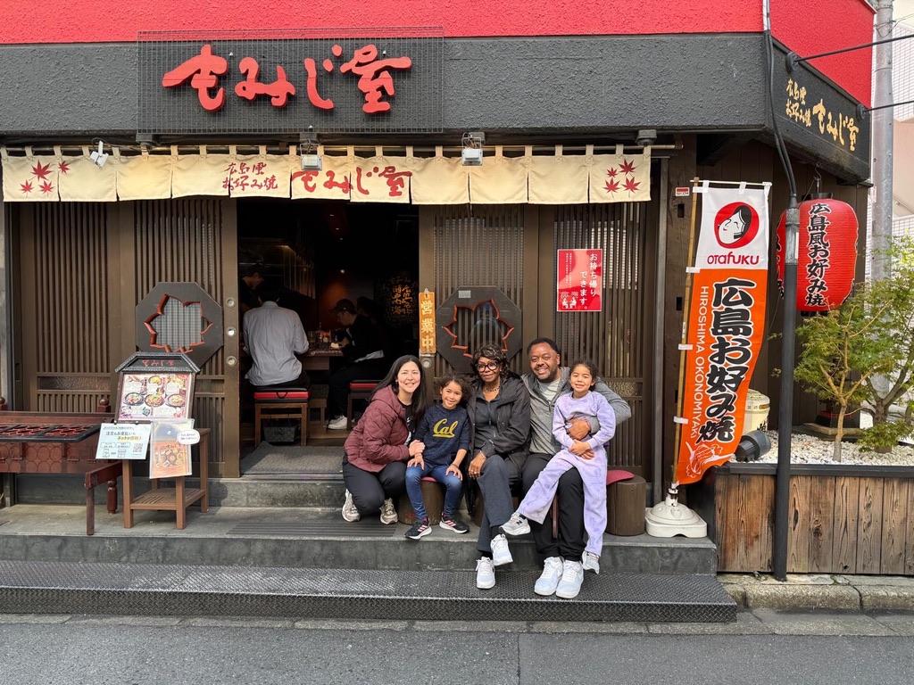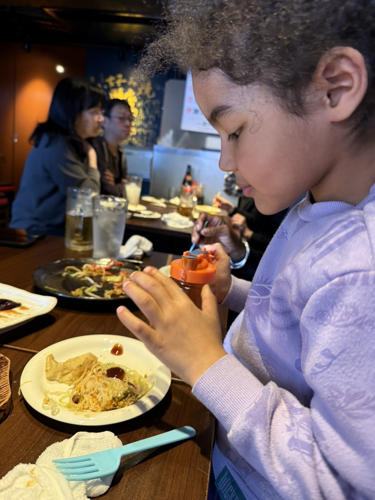We arrived at the Edmont Metropolitan Hotel and left our luggage behind in search of lunch. The sun shone on us as we navigated to Momijiya for okonomiyaki and yakisoba. Everyone was happy with their order- especially Sachi who had mochi and shrimp in her ‘pancake’!