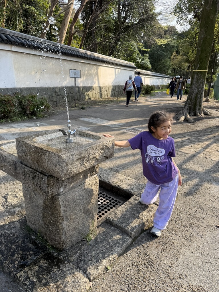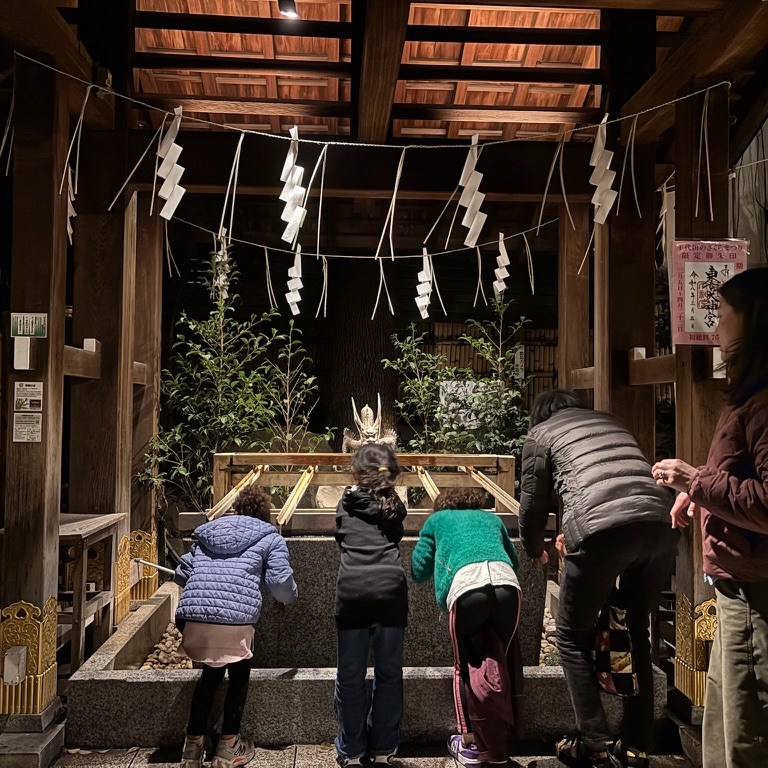 Though tired after a long day, we came upon a beautifully lit temple and couldn’t help but stop. I taught everyone how to wash your hands and mouth before entering and the girls wanted to get fortunes again. I was surprised that the shrine – though late in the evening- had a few young couples there. When I researched the temple that evening, (Tokyo Daijingu) I learnt it’s a temple for romance, love and marriage so it makes sense who was as the temple at that time!