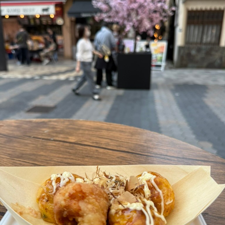 Saya found a ‘saya’ keychain and Sachi picked a maneki-neko (good luck cat) as their first souvenirs. I bought our first round of taiyaki and Margaret collected some gifts for her colleagues. The crowds were dense and the lunch options sparse because we didn’t have any restaurant reservations. We walked towards Sakura Street to find the fried chicken food truck called “Mama’s Chicken Food” and takoyaki from Tako Taco – a truck run by local brothers. The Sakura Street performance was fun – three young women wielding samurai swords and urging the crowd to participate in a creative theater performance of dance and ‘samurai lessons’.